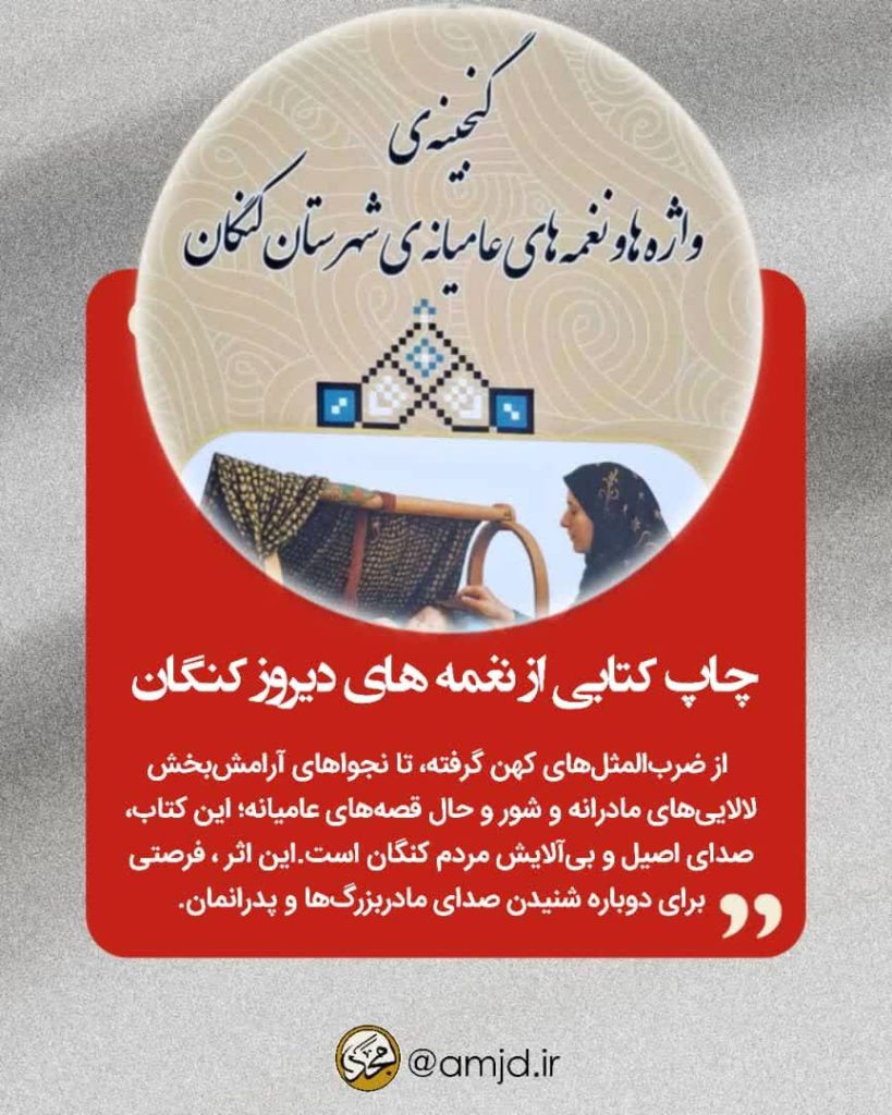 حاصل سالها عشق و پژوهش راضیه عباسی، معلم باسابقه، نویسنده و پژوهشگر کنگانی است. این کتاب، گنجینهای از ضربالمثلها، لالاییها و قصههای عامیانه مردم کنگان است که هویت و ریشههای فرهنگی این دیار را زنده نگه داشته است. از ضربالمثلهای کهن گرفته، تا نجواهای آرامشبخش لالاییهای مادرانه و شور و حال قصههای عامیانه؛ این کتاب، صدای اصیل و بیآلایش مردم کنگان است. این اثر ارزشمند، پلی است میان دیروز و امروز؛ فرصتی برای دوباره شنیدن صدای مادربزرگها و پدرانمان. با خواندن این کتاب فرهنگ کنگان را ورق بزنید و میراث شفاهی این شهرستان، از بنک تا شیرینو را مطالعه کنید. این کتاب در کتابسرای نیک واقع در خیابان استقلال و موسسه ذهن برتر موجود و در حال فروش است.